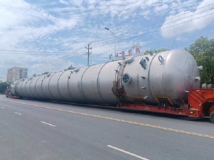 特別值得一提的是,反萃塔突破性采用整體運輸方案,徹底顛覆傳統(tǒng)分段制造再組裝的模式。通過量身定制的運輸工裝與科學(xué)嚴謹?shù)穆肪€規(guī)劃,該設(shè)備以近50米的運輸長度、超100噸的殼體重量(不含現(xiàn)場安裝內(nèi)件),一舉刷新公司單體設(shè)備運輸紀錄。這一創(chuàng)新實踐實現(xiàn)了大型設(shè)備運輸技術(shù)的跨越,為同類項目實施提供了全新范例。